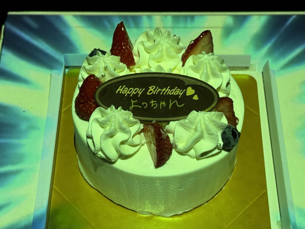 「Happy Birthday よっちゃん」と書かれた特別なケーキに、主役も思わず笑顔に。