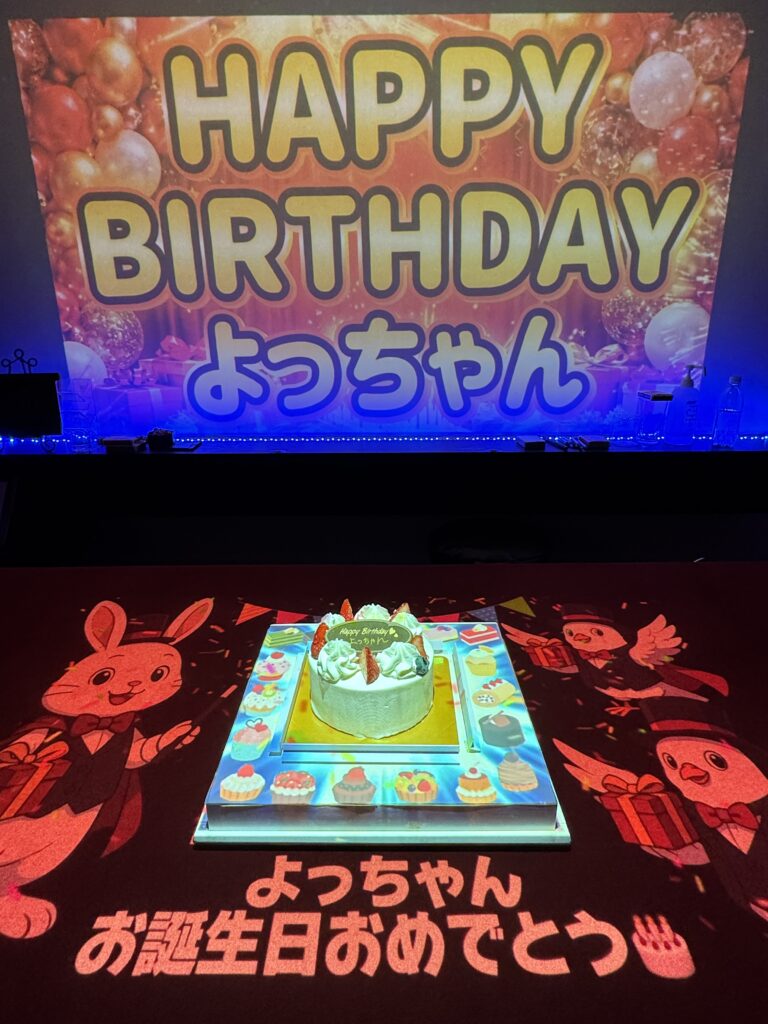正面スクリーンには「HAPPY BIRTHDAY よっちゃん」のメッセージが大きく表示。