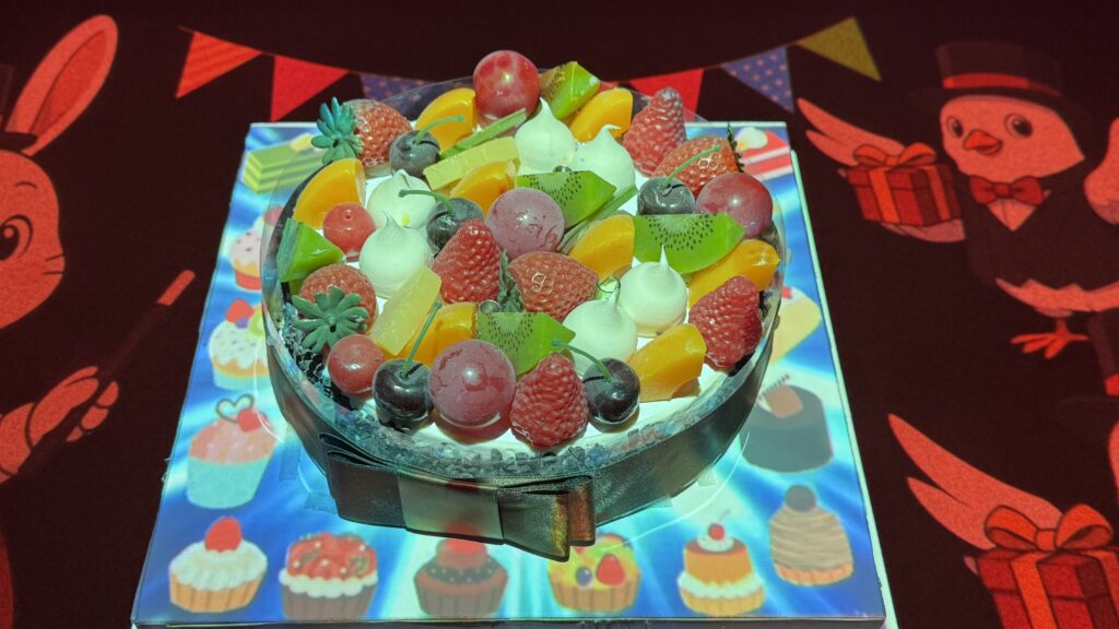 テーブル中央に用意されたケーキが、幻想的な光の演出とともに登場し、店内の雰囲気が一気にお祝いムードに包まれました。