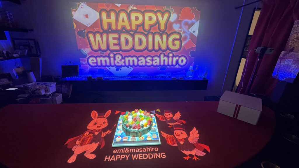 プロジェクションマッピングでお二人のお名前とお祝いメッセージを映し出し、他のお客様からも大きな拍手が起こりました。