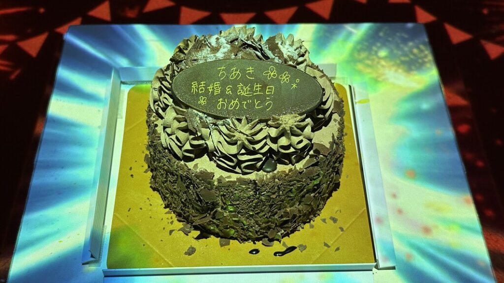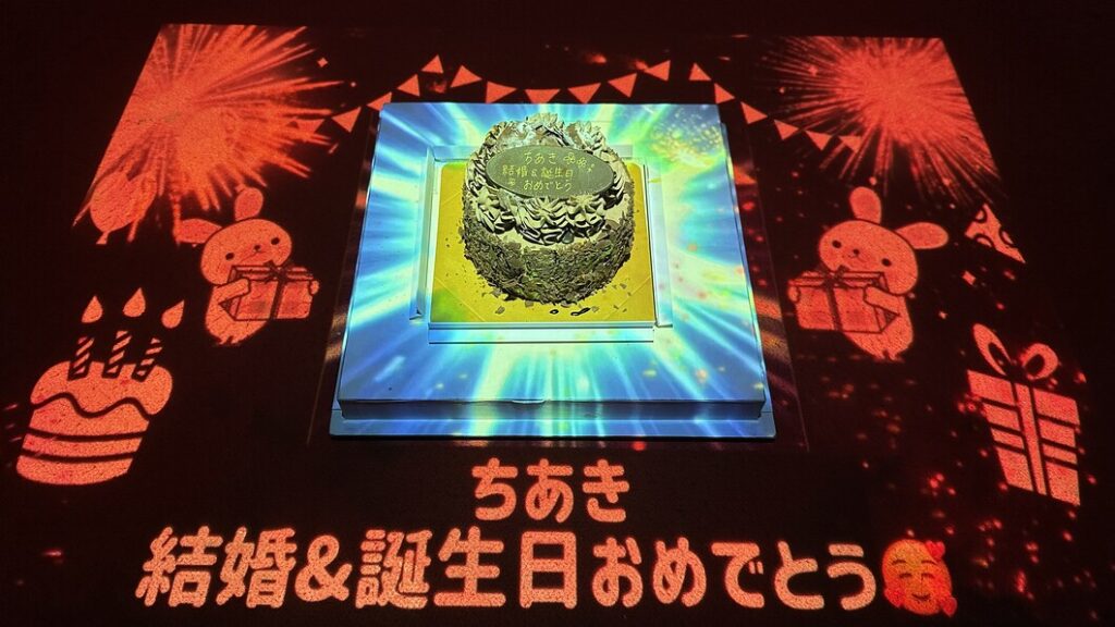 スクリーンには、「ちあき 結婚&誕生日 おめでとう」のメッセージを表示。