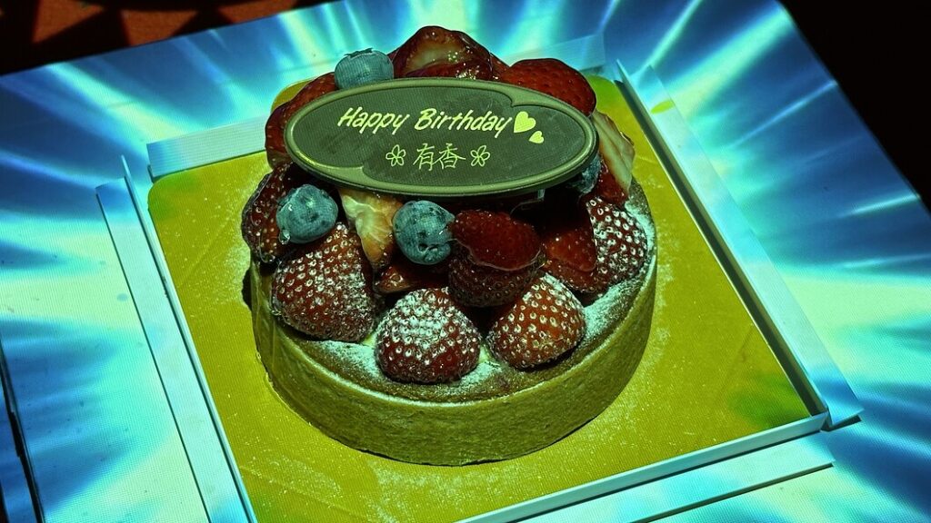 スポットライトに照らされたバースデーケーキが登場すると、店内からは自然と拍手が。