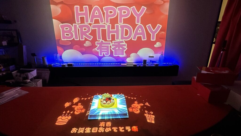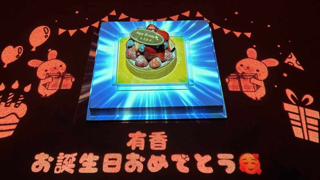 スクリーンいっぱいに広がる「HAPPY BIRTHDAY」の文字と、テーブルに映し出されるお祝い演出。