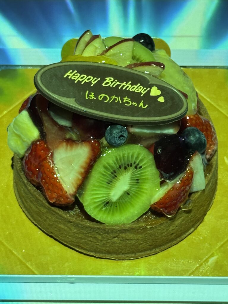 色とりどりのフルーツが乗ったフレッシュなケーキに、「Happy Birthday ほのかちゃん」のメッセージ入りプレートが添えられていました🍓