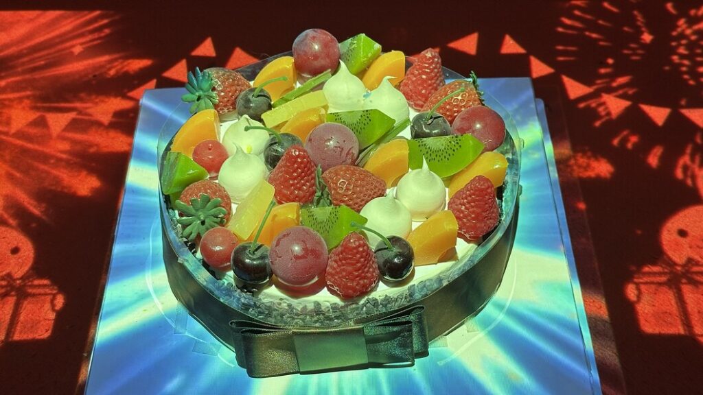 プロジェクション演出と照明に照らされたケーキが、特別な誕生日の始まりを演出します。