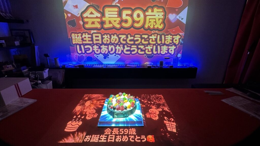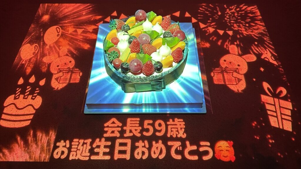 スクリーンには、「会長 59歳 誕生日おめでとうございます」のメッセージを表示。
